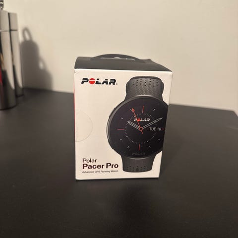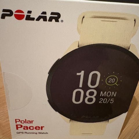 Polar Pacer GPS-løpeklokke i svart farge med silikonrem. Klokken har innebygd GPS og pulsmåling, egnet for løping og trening. Modellen har en rund urskive og digital skjerm som viser tid, dato og treningsdata. Aldri brukt, Nypris 2000