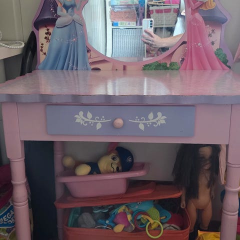 Barbie dukke med sminkebord og tilbehør inkludert hårføner, kam, sminke og smykker. Dukken har langt blondt hår, blå topp og lilla skjørt med mønster. Sminkebordet er hvitt med rosa ben og speil. Speilet er det med synlige bruksmerker. 100kr eller gi bud