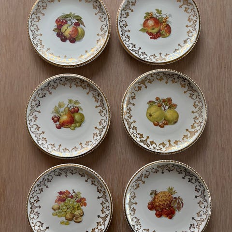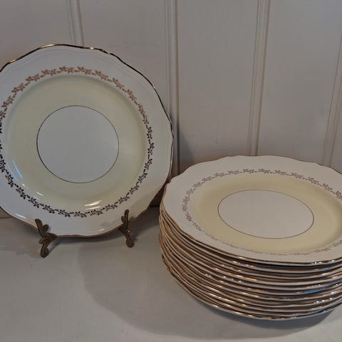 2 sjarmerende Gullregn asjetter med lys gul og gull dekor. Noe krakelert i glasuren, men ingen misfarging. Diameter 18 cm.