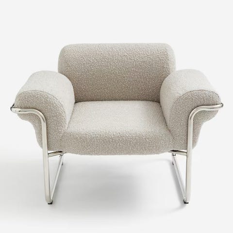 Selger VILDSUND lenestol i offwhite teddy-stoff med tilhørende puff.