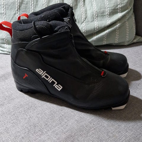 Skisko fra alpina selges billig da den har avflakkinger i stoffet som er oppe rundt ankel. Læret er enda i bra stand og er derfor en fullt brukelig skisko.