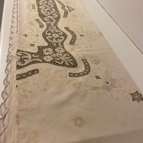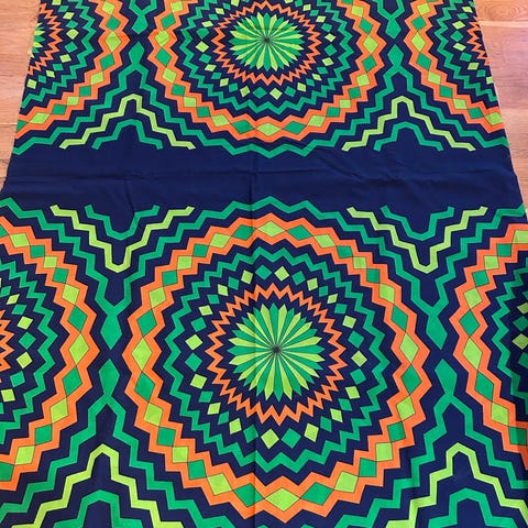 Fantastisk stykke tekstil fra Prentiss Lane kalt «Haitian Marked» Viser en scene fra et marked i svart , rosa og blått. I bomull, fra 60-tallet.