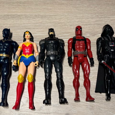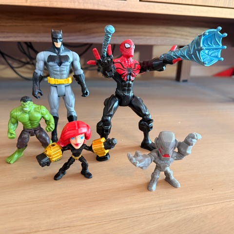 Marvel actionfigurer i ulike størrelser og modeller. Figurenes detaljer og farger varierer, er også noen andre småting selges med blå lekekasse
