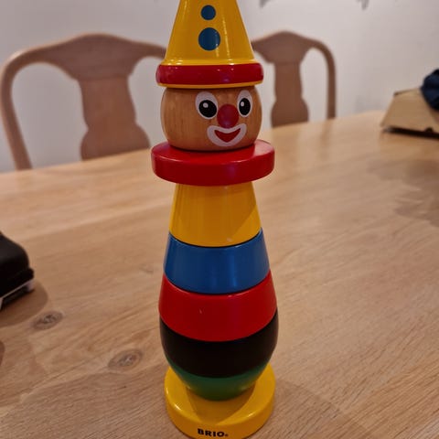 BRIO stableleke i tre med fargede ringer i gult, grønt, oransje og rødt. Leken består av en trepinne med fire stableringer i ulike størrelser og farger. Egnet for små barn for å utvikle motoriske ferdigheter og forståelse av størrelser og farger.