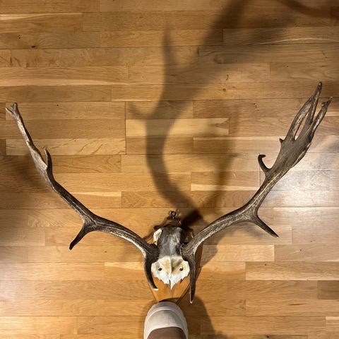 • Tilstand: Skallen er hvit og fin, og geviret har en naturlig og flott brunfarge. Treplaten er i god stand med originalt oppheng.