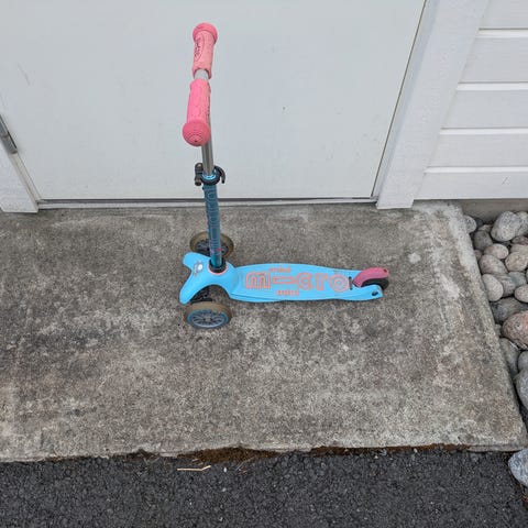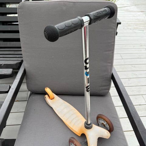 Micro Mini sparkesykkel i lilla farge. Passer for barn 3-5 år, med justerbart styre og tre hjul for stabilitet. Laget i slitesterkt materiale med sklisikker plattform. Egnet for utendørs bruk. Er i hovedsak brukt innendørs og er derfor i svært god stand.