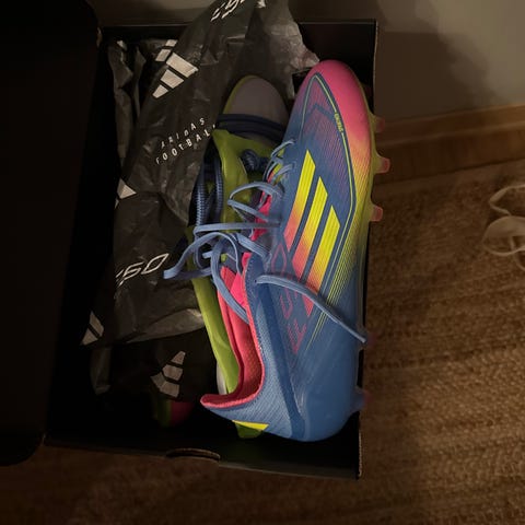 Adidas F50 League IN innendørs fotballsko i blå farge. Skoene er størrelse 42 (EU) med innendørs såle, egnet for innendørs fotballspill.