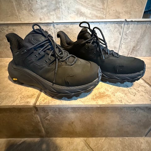 Hoka fottur sko i størrelse 40. Designet for fotturer med fokus på komfort og støtte. Fargen er mørk, og skoene har en robust konstruksjon egnet for utendørs bruk.