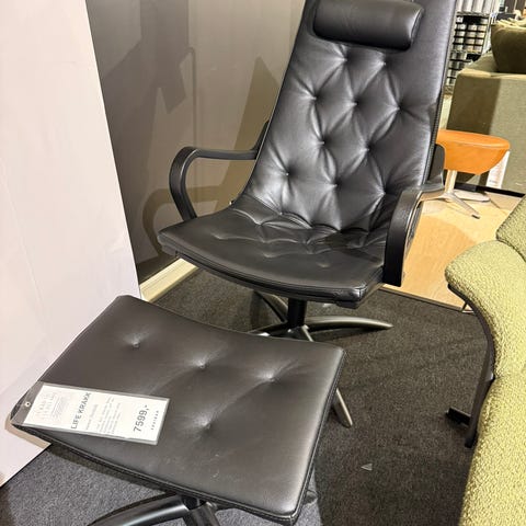 IKEA Poäng lenestol med fotskammel selges. Stolen har puter i sort imitert skinn og eikefiner ramme.