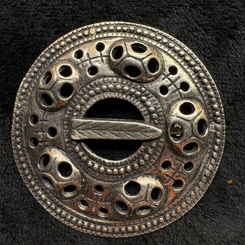 Kobberfarget metall. Vikingesmykke. Kan plasseres foran på vikingedrakt, selestakker og andre kjoler.