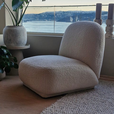 Pent brukt Diva loungestol i boucle/teddystoff fra Kremmerhuset. Nypris 3499 kroner.