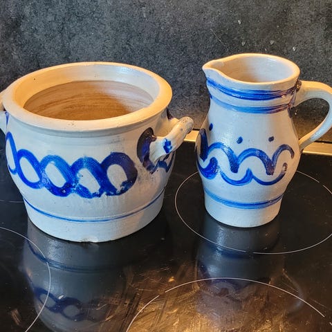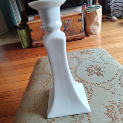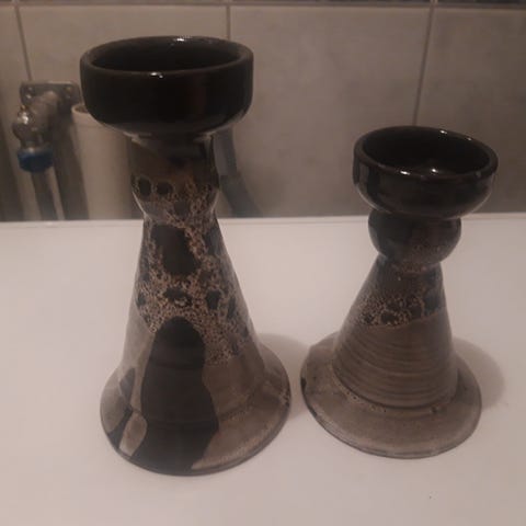 2 lysestaker i keramikk røde og blå i fargen, 15 cm høye . Med konisk form og detaljert tekstur. Passer til dekorasjon og bruk med telys eller små stearinlys.