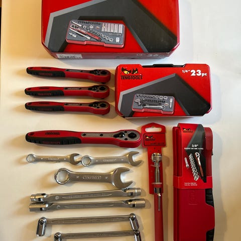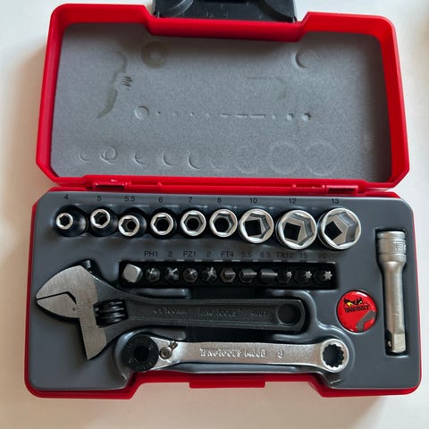 Praktisk lite sett med gode grep også for oss med store hender. Paktisk holder for hyllekant eller vegg. Sjekk bilde nr 3 for dimensjoner på verktøyet.