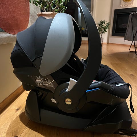 BeSafe iZi Go bilsete til baby med kapasitet opptil 13 kg (ca?). Setet er designet for å gi sikker transport av spedbarn i bil. Svart farge og polstret materiale for komfort.
