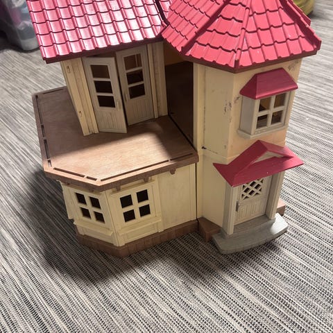 Sylvanian Families lekesett som inkluderer et hus med rødt tak og tilbehør som møbler og figurer. Settet inneholder også en oransje bil. Kalesjen på bilen virker ikke.