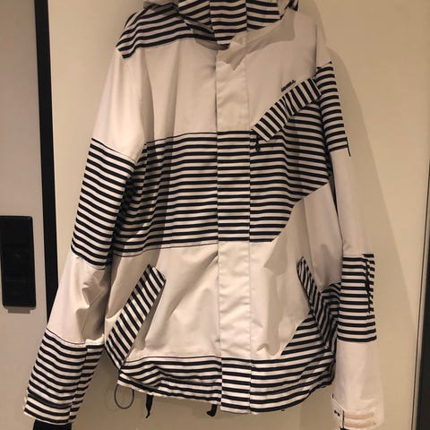 Jakken er brukt men er fremdeles hel og pen. Innermansjettene med tommelfingerhull er sydd for forsterking da de begynte å slippe, sitter godt fast nå (se bilde) og det er på grunn av dette jeg valgte kategorien synlig brukt.