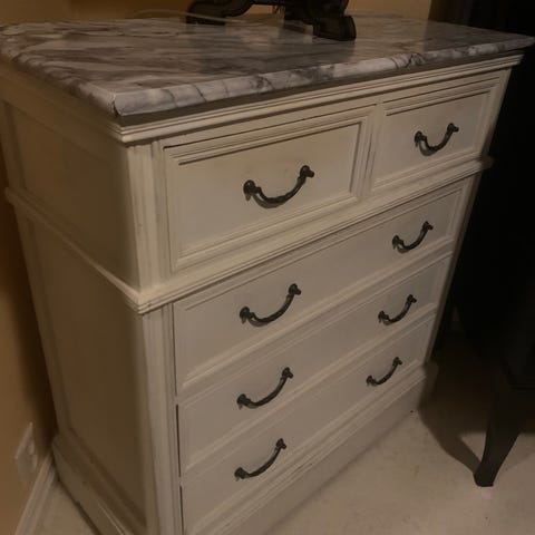 Solid kommode med 5 skuffer. Skuffene er hele og pene. Litt stygg topp plate.