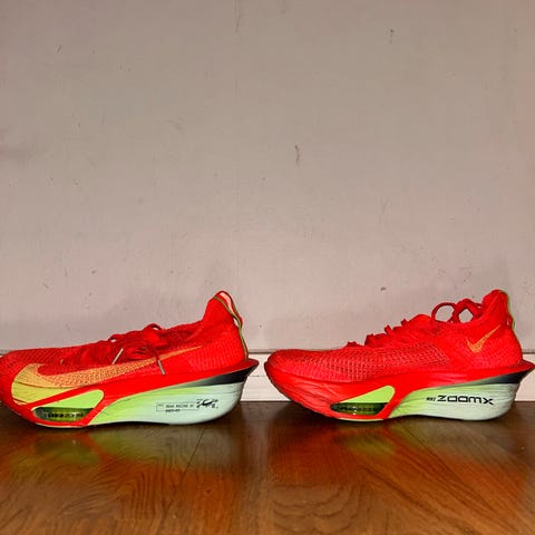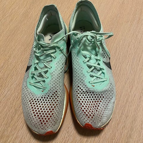 Nike Air Zoom Alphafly NEXT% i størrelse 44. Brukt mellom 6-7 mil så si ikke brukt. Størrelse 44 fra Nike er etter min erfaring litt små, passer de veldig godt til føtter som er 43.