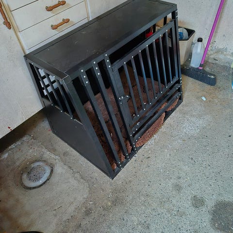 Hundebur i metall designet for bruk i bil. Buret er laget for å sikre kjæledyr under transport, med en dør som kan åpnes for enkel tilgang. Passer til ulike bilmodeller og gir en trygg oppbevaringsløsning for hunder under kjøring. H65 B 60 D 80