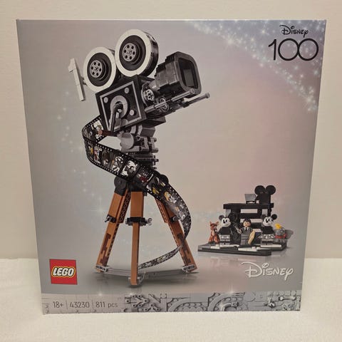 LEGO Disney Tribute Camera byggesett som forestiller et filmkamera på stativ. Inneholder detaljerte elementer som etterligner en klassisk filmkamera-modell. Passer for samlere og byggeentusiaster.