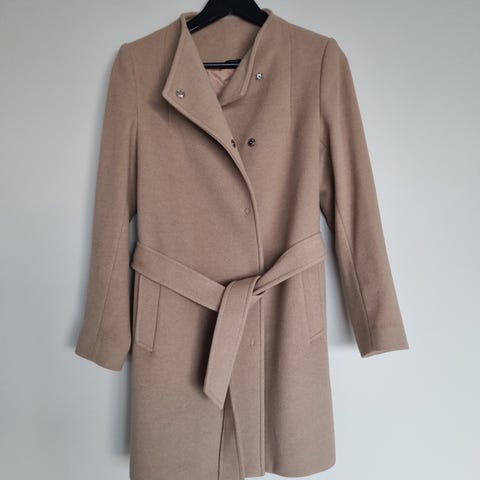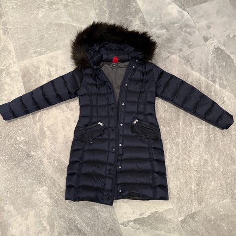 Dame dunkåpe i størrelse S/M med svart/blå design. Jakken er laget av dunmateriale og tilhører kategorien annet yttertøy. Den har hette og lang lengde.