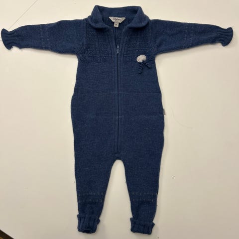 Lillelam barneheldress laget av 100 % merinoull i lyseblå. Fra røykfri og allergivennlig hjem. Str.56, passer til både gutter og jenter. Dressen har glidelås foran og er egnet for bruk i kaldt vær på grunn av det varme og myke merinoullmaterialet. Dressen er svært pent brukt.