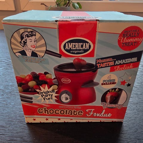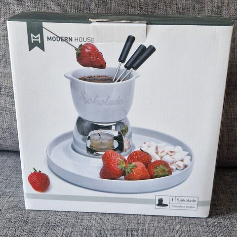 Sjokolade har lavt smeltepunkt, og du kan smelte direkte i skålen ved hjelp av telys i rommet under. Smelt sjokoladen i vannbad, gjerne med litt melk eller fløte. Fonduen er 10,5cm i diameter, 12,5cm høy og rommer 250ml.