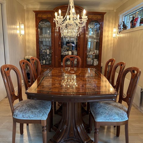 Spisestue med 7 stoler og stort og innholdsrikt vitrineskap
