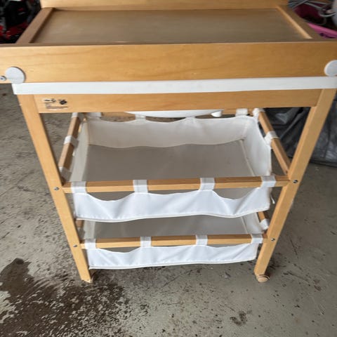 Pent brukt IKEA barnemøbler stellebord i hvit farge med mål 82 cm i lengde og 54 cm i bredde. Laget av tremateriale, designet for barn. Har to hyller under stelleflaten for oppbevaring.