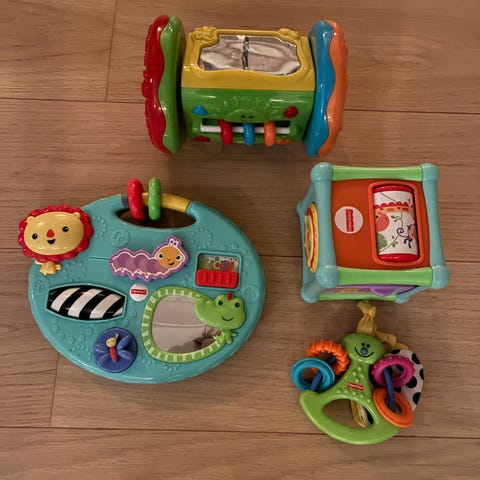 Lekepakke. Fisher-Price og playgro barneleker og aktivitetsleker i flere farger. Inkluderer ulike typer leker som stimulerer barnets sanser og motorikk.