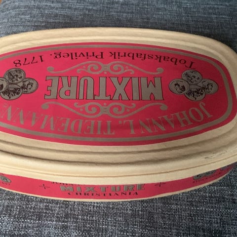 Boks med trykt motiv av Carl Johansgate i Christiania. Boksen er laget i metall og har et rektangulært format med avrundede hjørner. Den kan brukes til oppbevaring av små gjenstander.