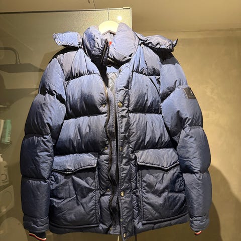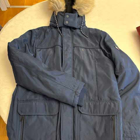 Tommy Hilfiger vinterjakke for herre i størrelse L. Jakken er blå og laget av dun, noe som gir isolasjon og varme. Egnet for bruk i kalde værforhold.
