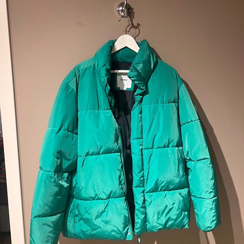 Regular fit jakke laget av stoff med pels-effekt på innsiden. Elastisk ribbekrage og lange ermer. Hoftelommer med trykknapp (litt annerledes enn på modellen) og innvendig lommedetalj. Ribbede avslutninger. Glidelåslukking foran. Kun brukt et par ganger. Koster 1195,- ny.