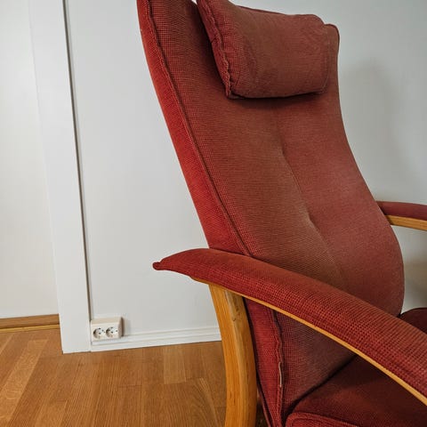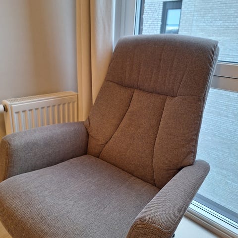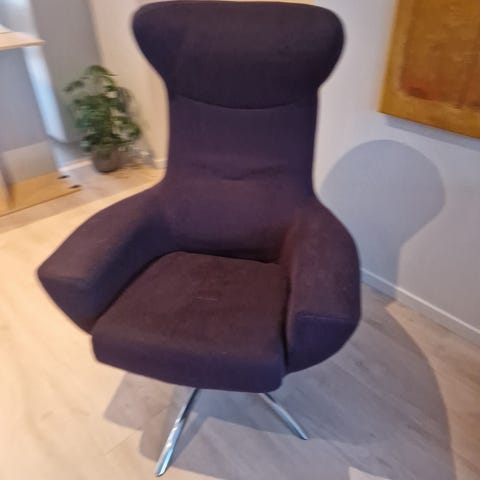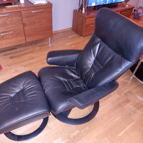 Pent behandlet og komfortabel hvilestol i brunt skinn. Rygg kan legges helt ned i hvilestilling. Understell i kraftig stål og ben lyst tre. Matchene fotskammel.