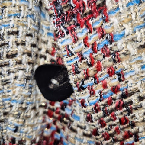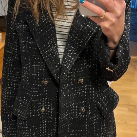 Sort og hvitt rutemønster med diskret gulltråd gir et sofistikert uttrykk. Teksturert stoff og gullknapp i front gir en eksklusiv finish – perfekt til både jobb og fest.