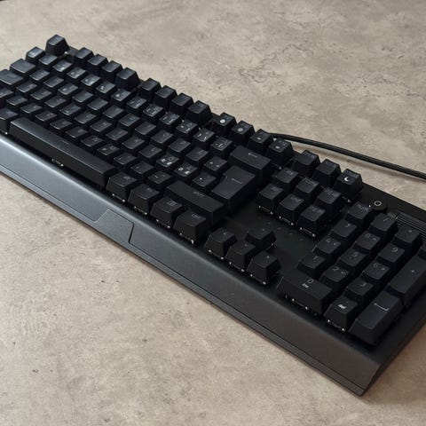 Selger en Razer BlackWidow Chroma V2 mekanisk gamingtastatur med Razer Green Switches (taktil og klikkende). Tastaturet er kjent for høy kvalitet, presis respons og flott RGB-belysning.