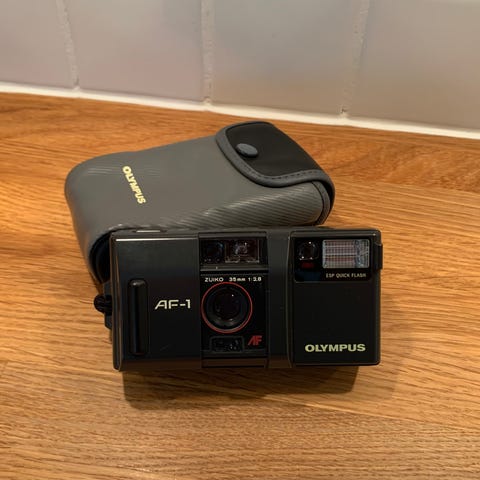 Olympus Trip XB40 AF. Testet og fungerer som det skal, inkludert blits. Vedlagt er et bilde, tatt med dette kameraet. Kameraet er i god stand og bruker to AA batterier og 35 mm film. Kameraet er fint og kompakt og praktisk å reise med 📸.