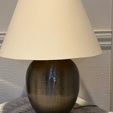 Nydelig vridd lampefot av alabast eller marmor. Solid og tung. Tot høyde med skjerm 47 cm, selve foten 35. Dia skjem 30 cm