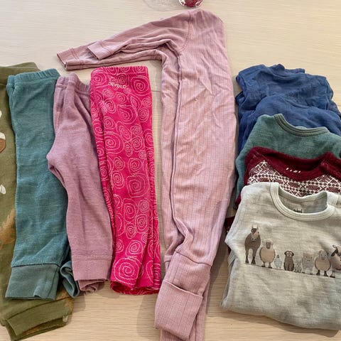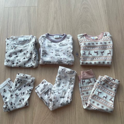Bodyene til venstre på første bilde har innside av bomull og viskose, resten er 100 prosent ull. Bodyene er veldig pent brukt. Merker som Joha, Hummel, Janus, Reflex, Name it og Cubus.