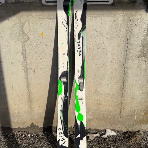 Eldre og godt brukte Volkl Shiro 183 cm selges. Ganske nylig planslipt, slipte kanter og preppet såle. Mye kosmetiske riper på oversiden, uten praktisk betydning. Datidens pudderski med mye god omtale. Marker Tour binding med gåfunksjon om man vil dra med seg tunge ski opp på toppen i puddersnø 😂