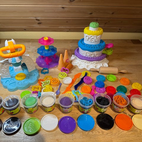Play-Doh barnleketøy i flere farger. Produktet har ulike former og funksjoner for kreativ lek og forming. Egnet for barn, laget i plastmateriale.