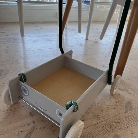 Pent brukt gåstol med ulike leker