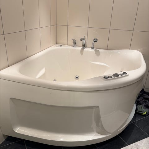 Hjørnebadekar i hvit farge med massasjefunksjon. Passer for baderom med plass til hjørneløsning. Laget for avslapning og komfort. Fungerer som den skal.