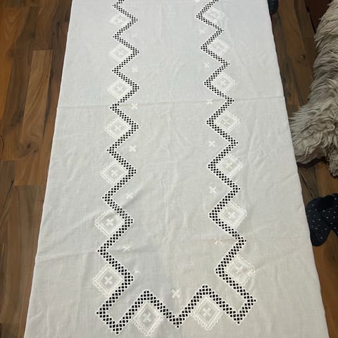 Brodert juleløper/juleduk. Mål:L=65cm B=26cm. Løperen kan brukes som den er, eller så er den perfekt til å omgjøres til et "aggressivt broderi".