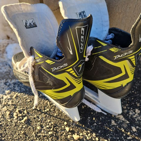 CCM Ishockeyskøyter for barn i størrelse 38. Skøytene er designet for ishockey og har svart og gul farge. Egnet for barn som spiller ishockey. Brukt litt i 1-2 sesonger, men ingen synlige bruksmerker og bladene på skøyene er fremdeles fine og skarpe.
