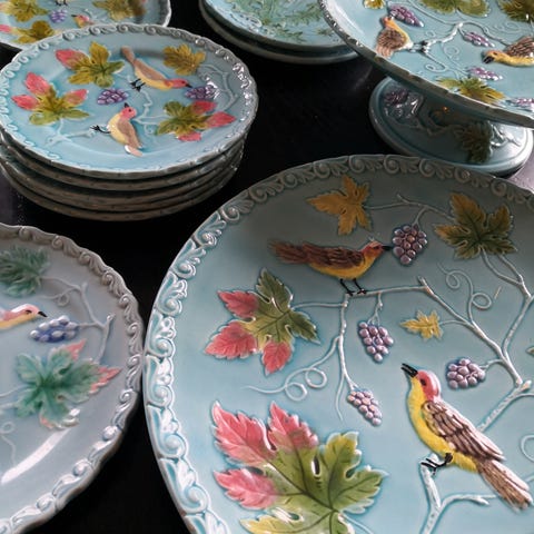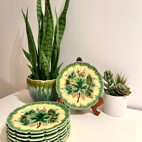 Vakkert og komplett kaffeservise i art deco-stil fra Victoria China, produsert i Tsjekkoslovakia ca. 1920–1940. Serviset har nydelig iriserende perlemorsglasur i grønn/turkis tone med gullkanter og klassiske art deco-former.