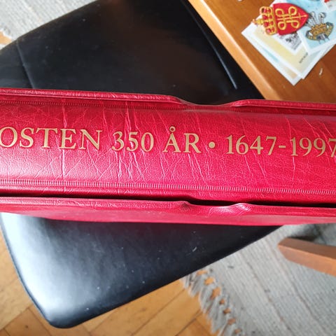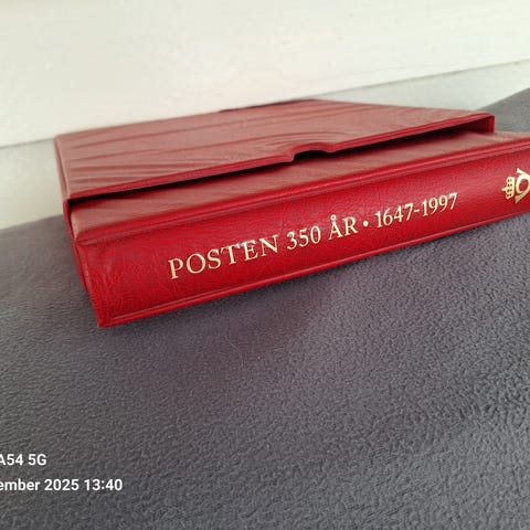 Posten 350 år 1647-1997 frimerkesamling i rød perm. Samlingen inneholder frimerker og tilhørende informasjon fra perioden 1647 til 1997.