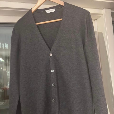 Avslappet overshirt laget av myk og lett kokt merinoull, designet med skjortekrage, rå kanter.