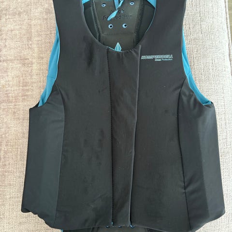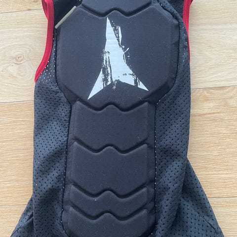 beskyttelsesvest i svart med røde detaljer. Vesten har polstring for beskyttelse ved aktiviteter som krever ekstra sikkerhet. Designet for å gi bevegelsesfrihet samtidig som den beskytter overkroppen.