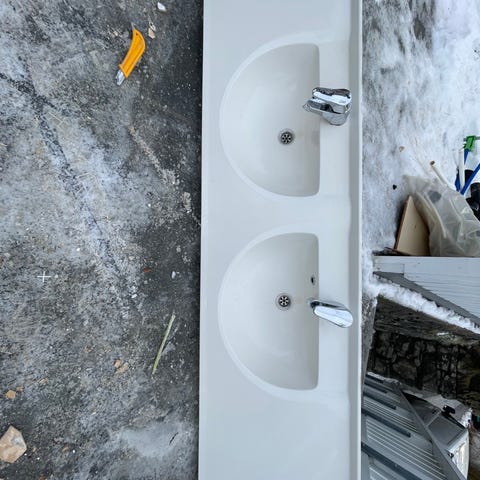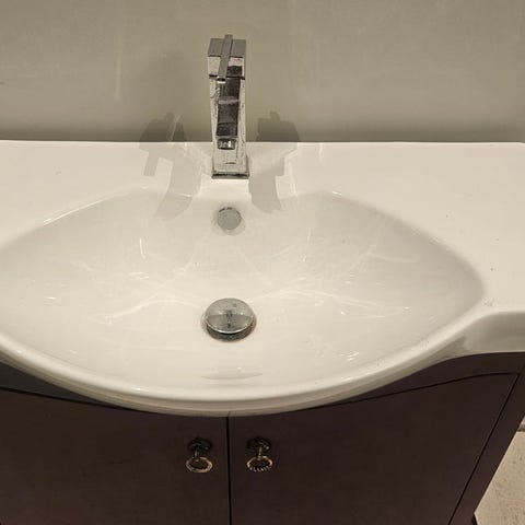 Baderomsinnredning i hvit bestående av servant med underskap og skuff. Inkludert er høyskap med flere hyller. Innredningen er fra 2005 og i god stand.